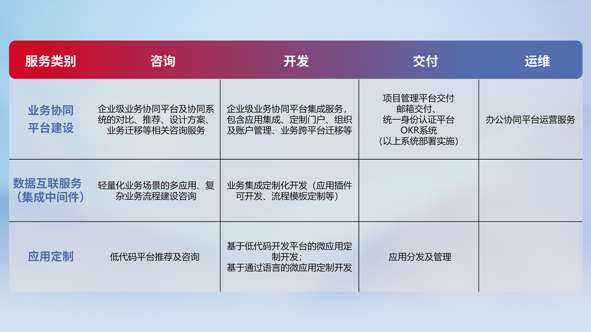 针对钉钉、、企微、、IDaas等平台级产品提供产品的规划、、、方案、、交付、、、定制化开发等服务,,实现如统一协同办公、、、、智能客户服务、、混合会议管理、、、智能数据查询、、等业务场景,,,实现数字化转型。。。
