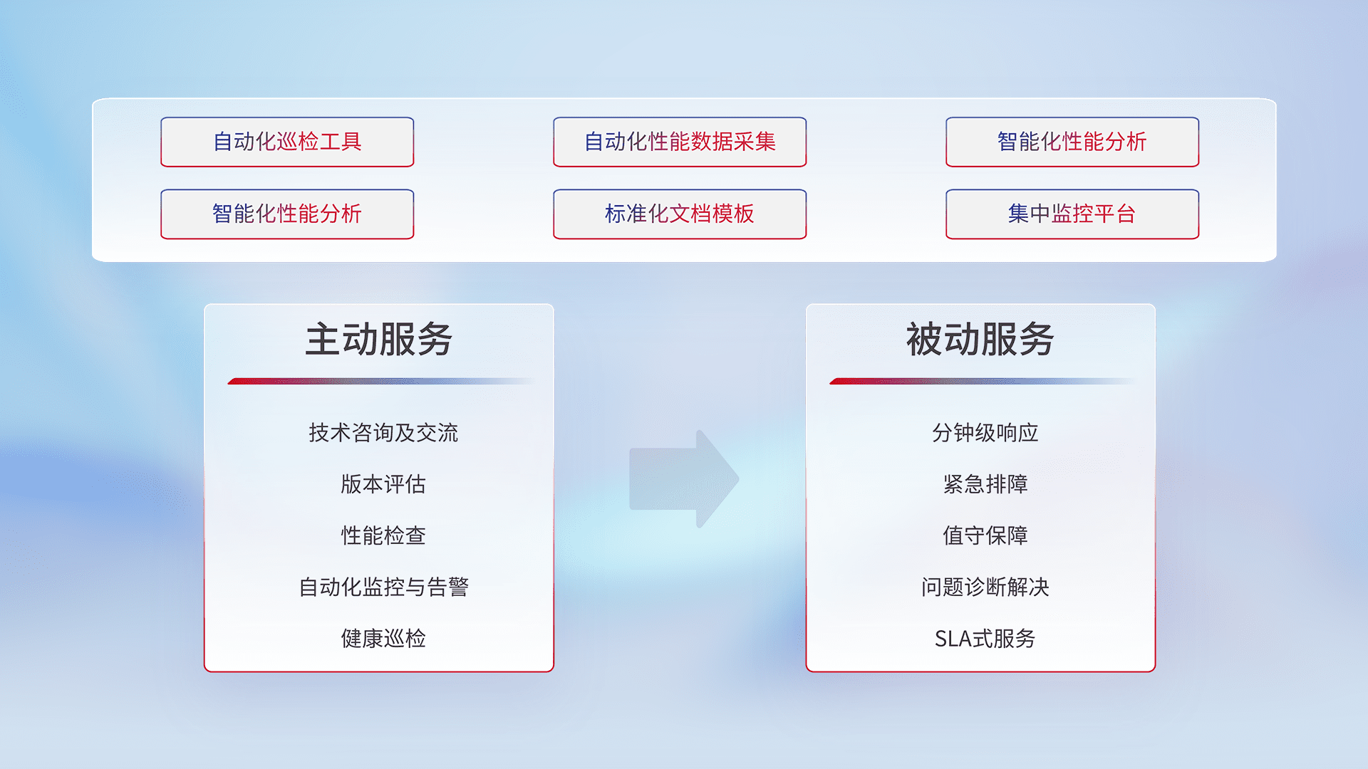 智能化工具和标准化文档,,,保障服务质量,,提供主动服务(包含技术咨询、、、、版本评估、、、性能检查、、自动化监控与告警、、、、健康巡检)和被动服务包含(分钟级响应、、紧急排障、、、值守保障、、问题诊断解决、、、、SLA服务)。。。